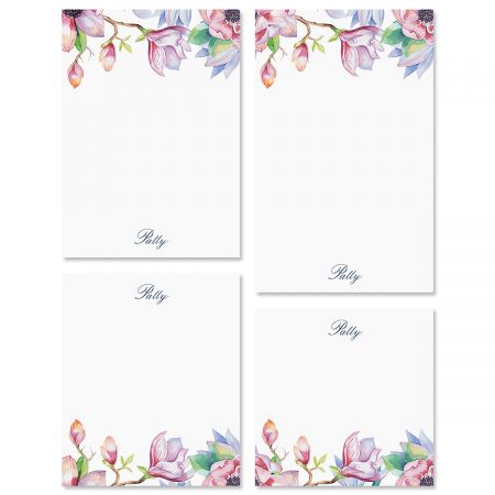 Southern elegance at your fingertips. Our Magnolia personalized notepad sets make your notes, memos and to-do lists shine with the beauty of magnolia blooms. These attractively designed notepads are great for keeping track of to-dos, writing short notes and jotting down important information while out and about. Make great anytime gifts. Personalized for you. Set of 4 sizes, 100 sheets per pad, gift packaged.